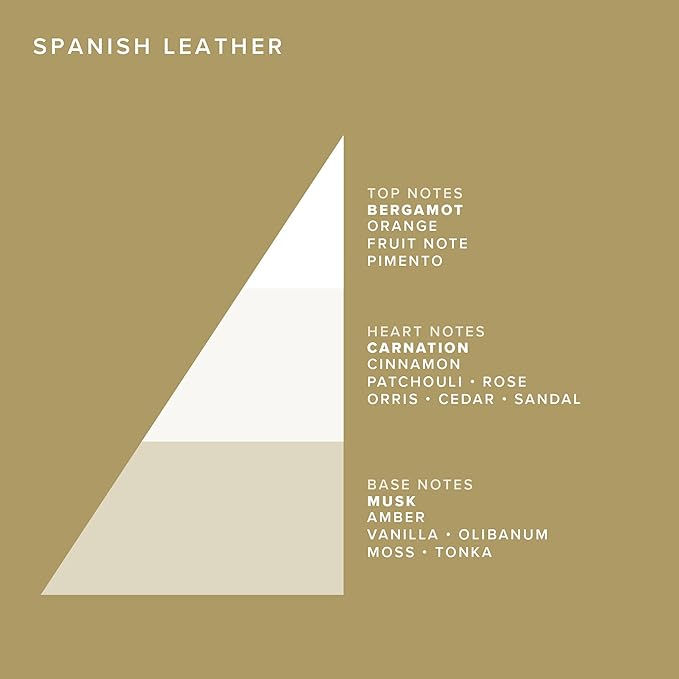 - SPANISH LEATHER: A rich, but subtle blend, with top notes of Fruit, Bergamot, Orange, and Pimento, with a heart of Carnation, Cinnamon, Patchouli, Rose, Orris, and woody notes, all resting on a base of Amber, Moss, and Musk, Vanilla and Tonka