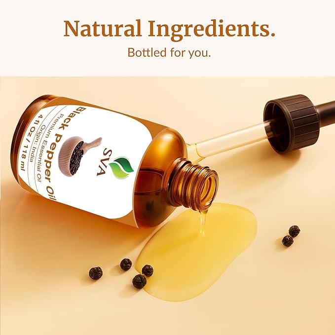 - Premium Quality Black Pepper Essential Oil: SVA Black Pepper Oil essential oil 4oz is obtained by steam distillation of Piper Nigrum berries. Our Black Pepper oil is free of preservatives and comes with a dropper for easy application. It is not tested on Animals. We care for you!