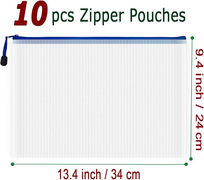 - 10 PCS Plastic mesh zipper bags, 13.4 x 9.4 inch A4 size. Widely used in office supplies, school, home daily life, hospital and travel. These pouches could meet your needs in all ways