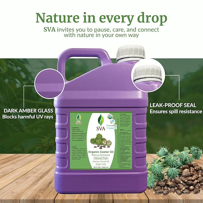 - Premium High-Quality Organic Castor Carrier Oil: SVA Castor Oil is obtained by cold-pressed extraction of Ricinus Communis seeds. Our Castor oil is Hexane-free and free of preservatives. It is not tested on Animals. We care for you.
