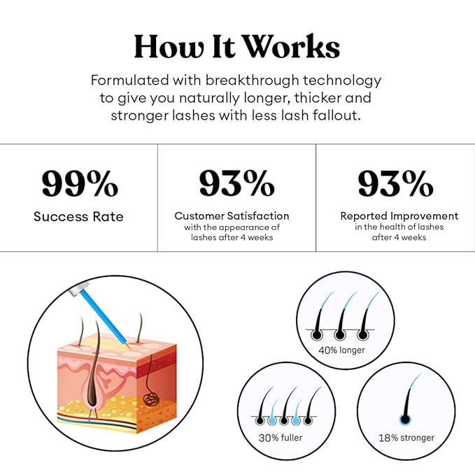 - Breakthrough Technology: It works by activating the hair follicle to promote rapid growth of eyelashes, making them grow longer, thicker, and fuller. This very same serum also toughens up the epidermal junction (where the lash grows out of the eyelid), helping prevent the newly grown eyelashes from falling out.