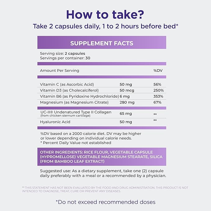 - Easy Daily Use: Take two capsules daily, 1-2 hours before bedtime, to help support skin, joints, and bone health. This 30-day supply fits easily into your routine, providing care without hassle. Stay active and keep up your wellness journey!