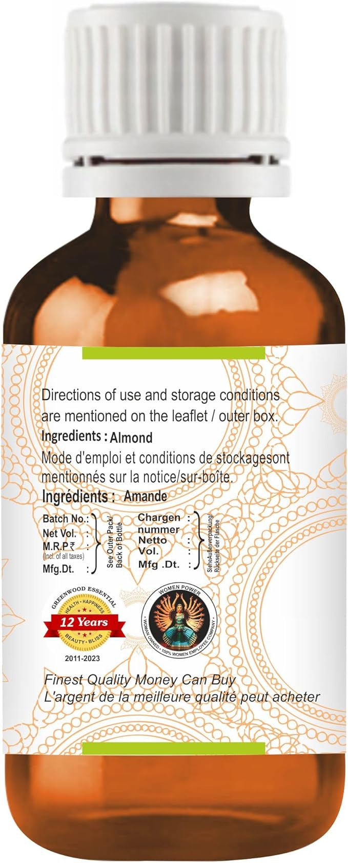 - Quantity - 15ml (0.50 oz) Container Type - High Quality Amber Glass Bottle with internal Plastic Euro Dropper.METHOD OF EXTRACTION: Cold Pressed Botanical Name -Prunus dulcis, 100% Pure, Natural, Undiluted, Premium, Therapeutic Grade Carrier Oil, Alcohol Free, Solvent Free, Vegan, Cruelty Free, Not Tested on Animals.