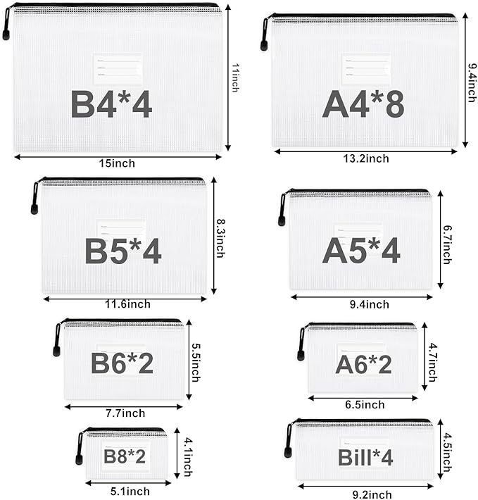 - Package includes: 30 zipper mesh pouches in 8 sizes. They are 4pcs B4 (15 x 11 inches), 8pcs A4 (13.2 x 9.4 inches), 4pcs B5 (11.6 x 8.3 inches), 4pcs A5 (9.4 x 6.9 inches), 2pcs B6 (7.7 x 5.5 inches), 2pcs A6 (7.3 x 4.5 inches), 4pcs Bills (9.4 x 4.3 inches), 2pcs B8 (5.1 x 4.1 inches).