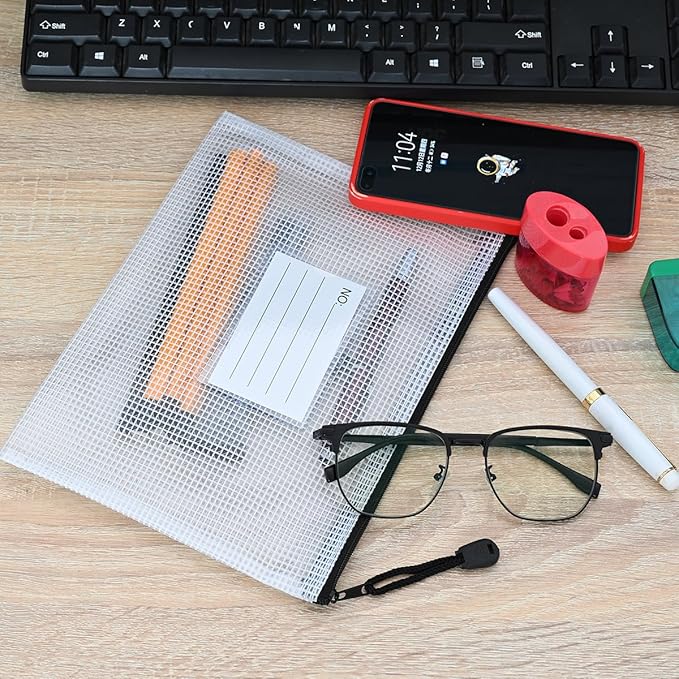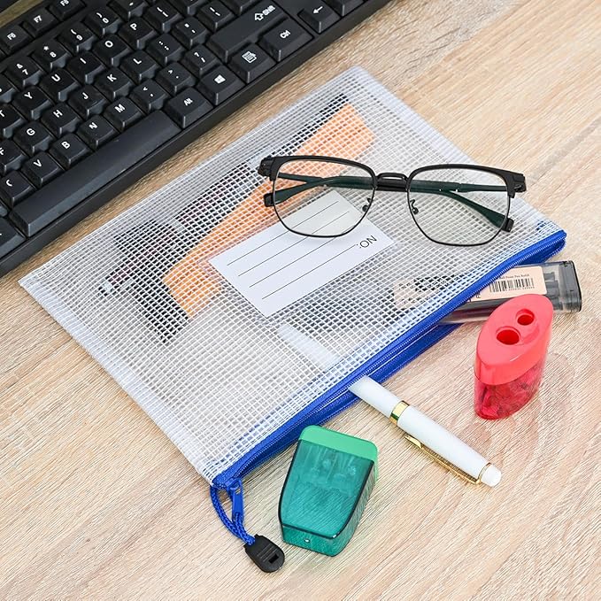 - 12Pcs Mesh zipper bags with label pocket, A5 size 9.2x6.7 inch. Widely used in Office Home Hospital and Travel. Great zipper file bags, board game storage bags, pencils pouches, puzzles bags, cross stitch projects bags or keeping various craft projects organized. These mesh bags could meet your needs in all ways