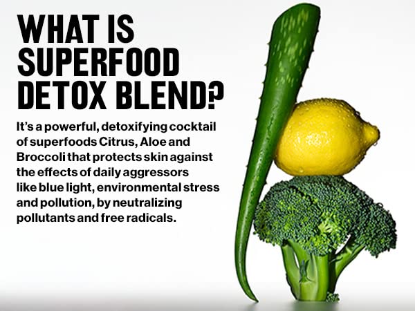 - Infused with a Superfood Detox Blend of the powerful antioxidants Citrus, Aloe & Broccoli to help neutralize harmful free radicals and protect skin