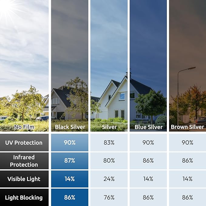 - UV Protection, Glare Reduction: Blocks up to 90% of UV rays, this window film heat blocking helps protect flooring, furniture, and draperies from fading. It also protects your eyes and skin from harmful UV rays. With 14% VLT, it effectively reduces glare while allowing some visible light in, creating a comfortable indoor environment