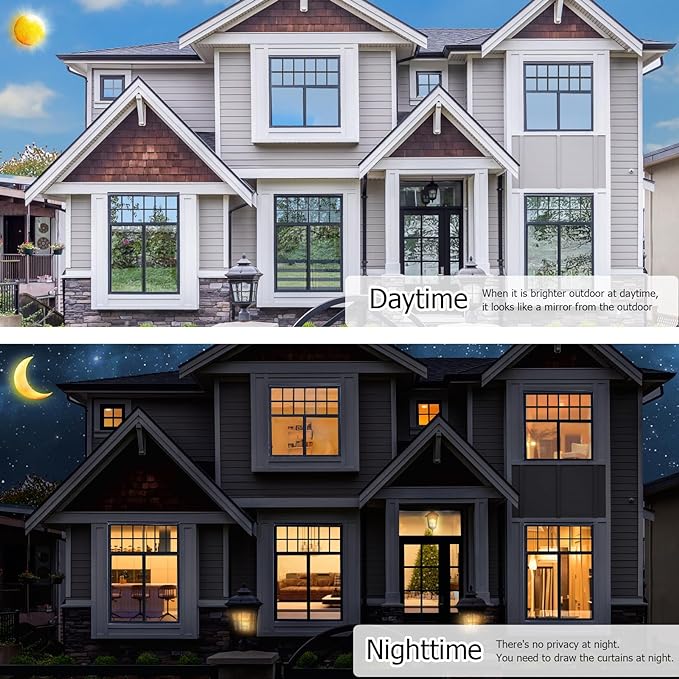 - DAYTIME WINDOW PRIVACY FILM: Attention about the privacy of one way window film, there is different privacy effect between daytime and night. When the outdoor light is stronger than indoor at daytime, the reflective window film provides a mirror effect, you can see out and no one can see in. Note: When the inside light is stronger than the outside at night, the mirror effect will be reversed, people outside can see inside. Do remember to draw the curtain at night.
