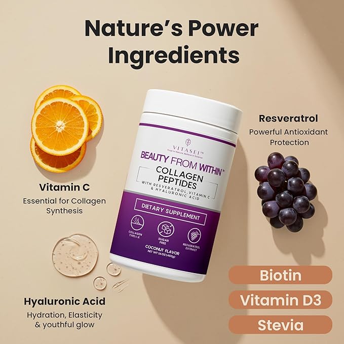 VITASEI Hydrolyzed Collagen Peptides Powder with Vitamin C & Resveratrol - Hair, Skin and Nails Vitamins for Women & Men - Bone and Joint Supplement - Coconut Flavored - 16 oz
