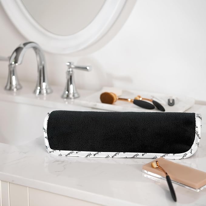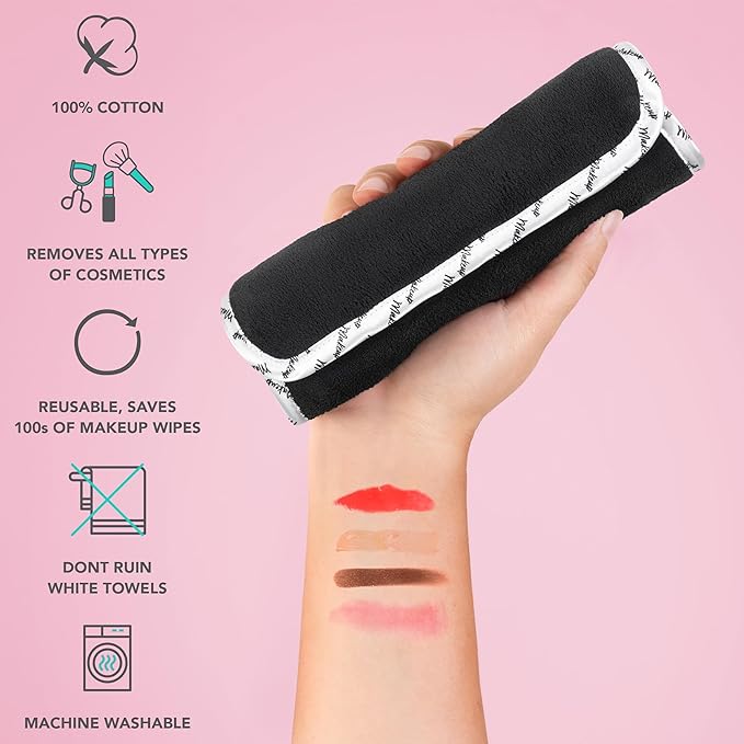 - PRETTY MAKEUP REMOVAL CLOTHS: Elevate your cleansing experience with Arkwright Home’s BCK2U Coral Fleece Black Microfiber Makeup Remover Washcloths beautifully decorated with a white sating piping edge printed with a repeat of the word “Makeup” in a sophisticated script font. Expertly designed for gentle skincare, these plush, 13”x13” cloths provide a gentle makeup removal experience. Each pack contains three premium-quality cloths, so you will always have one ready.