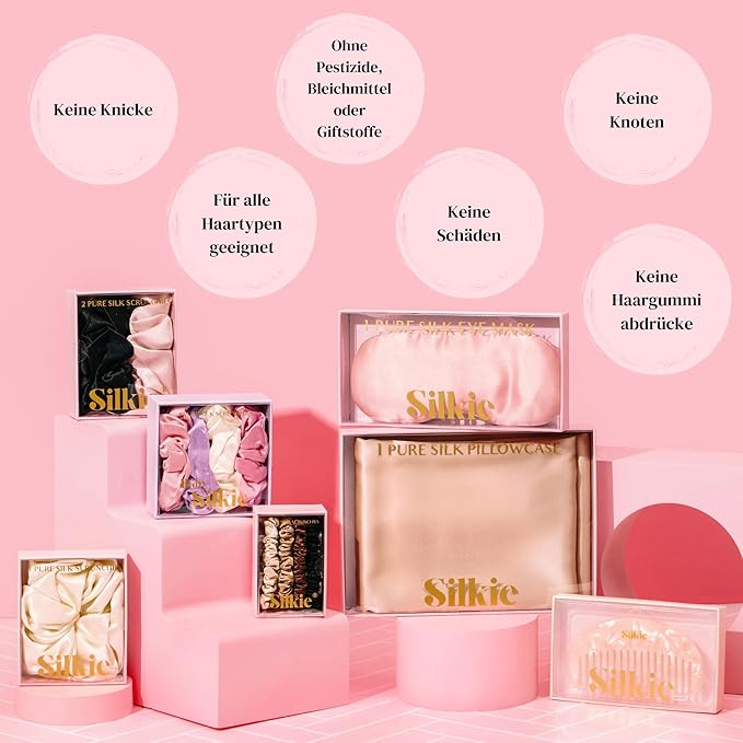 - 100% MULBERRY SILK - Formulated with the highest quality silk, Silkie scrunchies glide through the hair, protecting it from split ends and causing no damage. Tie your hair in a bun at night with a Silkie scrunchie to prevent friction, tangles and damage overnight. The smooth surface of Silkie scrunchies prevent hair being caught and snagged, unlike cheaper elastic hair ties