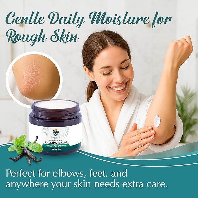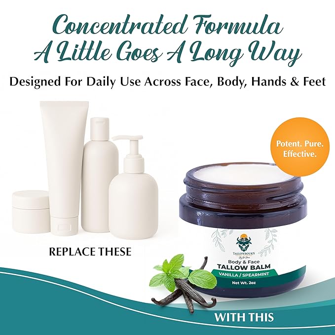 - Vanilla and Spearmint Blend: Experience the calming essence of vanilla and the invigorating scent of spearmint, all while benefiting from the moisturizing properties of our beef tallow for face and body