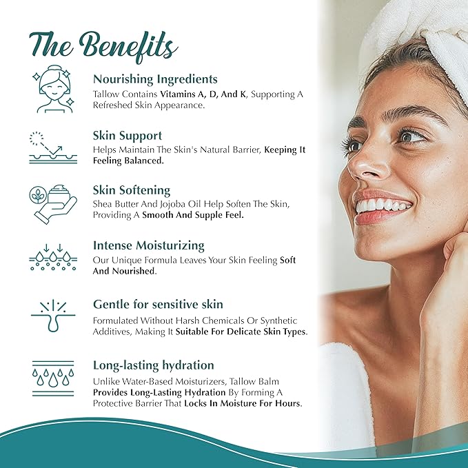 - Hydrating Beef Tallow for Skin: Our beef tallow moisturizer, enriched with shea butter, is designed to support skin elasticity and provide a firmer, more youthful appearance