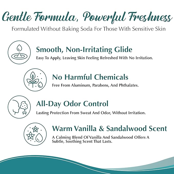 - Calming Aroma: Indulge in the calming, earthy scent of our sandalwood and vanilla scented deodorant, offering a soothing fragrance that keeps you fresh and confident throughout the day