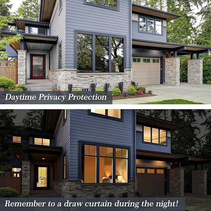 - DAYTIME WINDOW PRIVACY FILM: Attention about the privacy of one way window film, there is different privacy effect between daytime and night. When the outdoor light is stronger than indoor at daytime, the reflective window film provides a mirror effect, you can see out and no one can see in. Note: When the inside light is stronger than the outside at night, the mirror effect will be reversed, people outside can see inside. Do remember to draw the curtain at night.