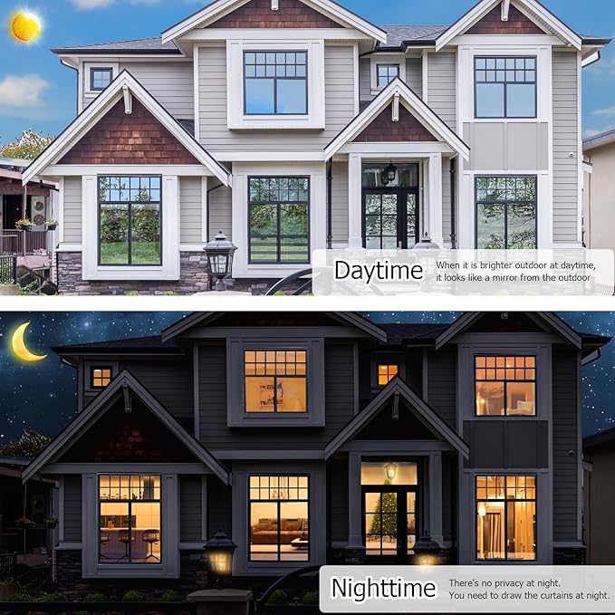- DAYTIME WINDOW PRIVACY FILM: Attention about the privacy of one way window film, there is different privacy effect between daytime and night. When the outdoor light is stronger than indoor at daytime, the reflective window film provides a mirror effect, you can see out and no one can see in. Note: When the inside light is stronger than the outside at night, the mirror effect will be reversed, people outside can see inside. Do remember to draw the curtain at night.