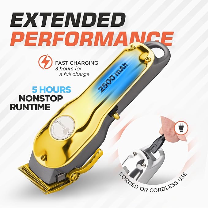 - š Powerful Battery & Quick Charging - The 2500mAh Li-ion battery built into this clippers for haircut machine means a remarkable 5-hour running time with a charge of only 3 hours for maximum performance in all aspects. Perfect barber supplies and barber accessories.