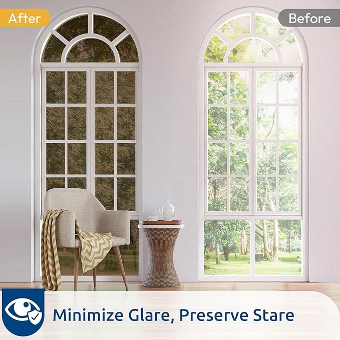 - UV Protection, Glare Reduction: Blocks up to 90% of UV rays, this window film heat blocking helps protect flooring, furniture, and draperies from fading. It also protects your eyes and skin from harmful UV rays. With 14% VLT, it effectively reduces glare while allowing some visible light in, creating a comfortable indoor environment