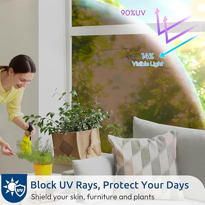 - UV Protection, Glare Reduction: Blocks up to 90% of UV rays, this window film heat blocking helps protect flooring, furniture, and draperies from fading. It also protects your eyes and skin from harmful UV rays. With 14% VLT, it effectively reduces glare while allowing some visible light in, creating a comfortable indoor environment