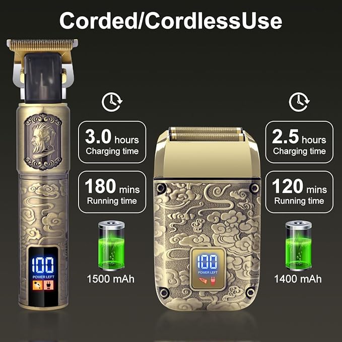 - Excellent Battery Performance: With a built-in rechargeable high-capacity high-quality and safe lithium-ion battery, T-type hair clipper charge for just 3 hours and get up to 180 minutes of cordless runtime. and electric foil shaver charge for just 2.5 hours and get up to 120 minutes of cordless runtime. Plus, our kit is adaptable to worldwide voltages, so you can look sharp no matter where you are