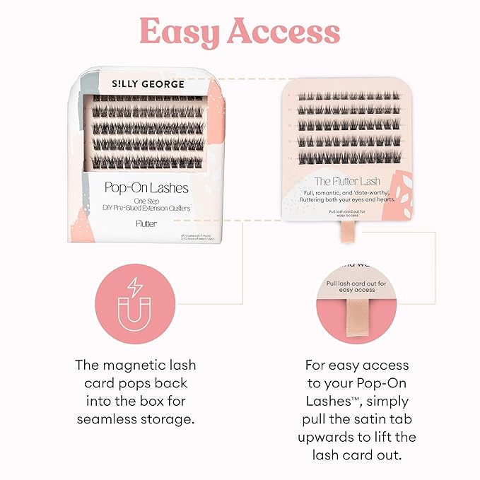 - NATURAL & EFFORTLESS POP-ON LASH CLUSTERS: Experience instant one step salon-quality lashes! Silly George Pop-On, pre-glued, handmade clusters deliver custom, weightless, and natural-looking lashes lasting 5-10 consecutive days!