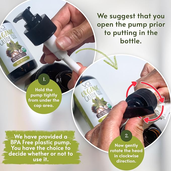 - 32 OZ Organic Castor Oil Glass Bottle With A Pump: We have added a pump for convenience with our organic cold pressed castor oil hexane free for no mess dispensing. No extra dripping and no inconvenience, giving you the full use of our organic golden castor oil!