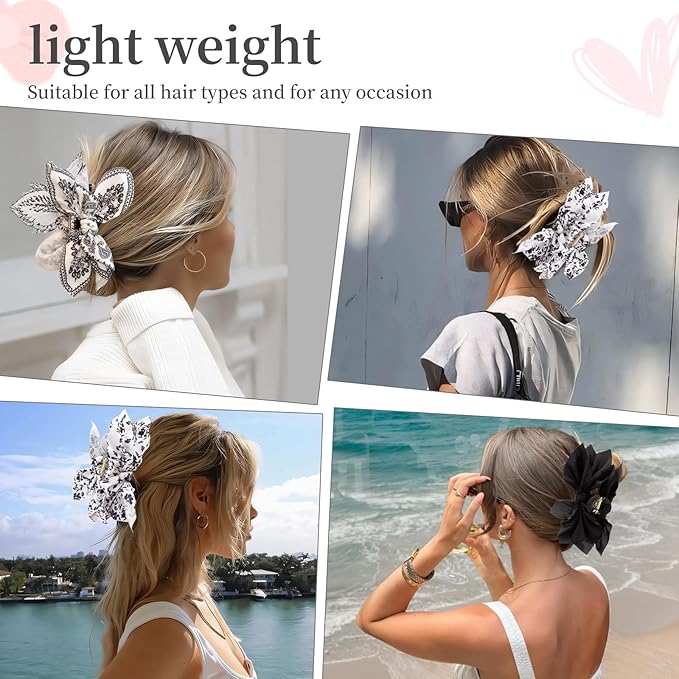 - Stylish Aesthetic: With their satin material and large bow embellishments,the black white flower bow hair accessories color options provide a trendy and fashionable look,our bow claw clips add a touch of elegance and charm to any hairstyle