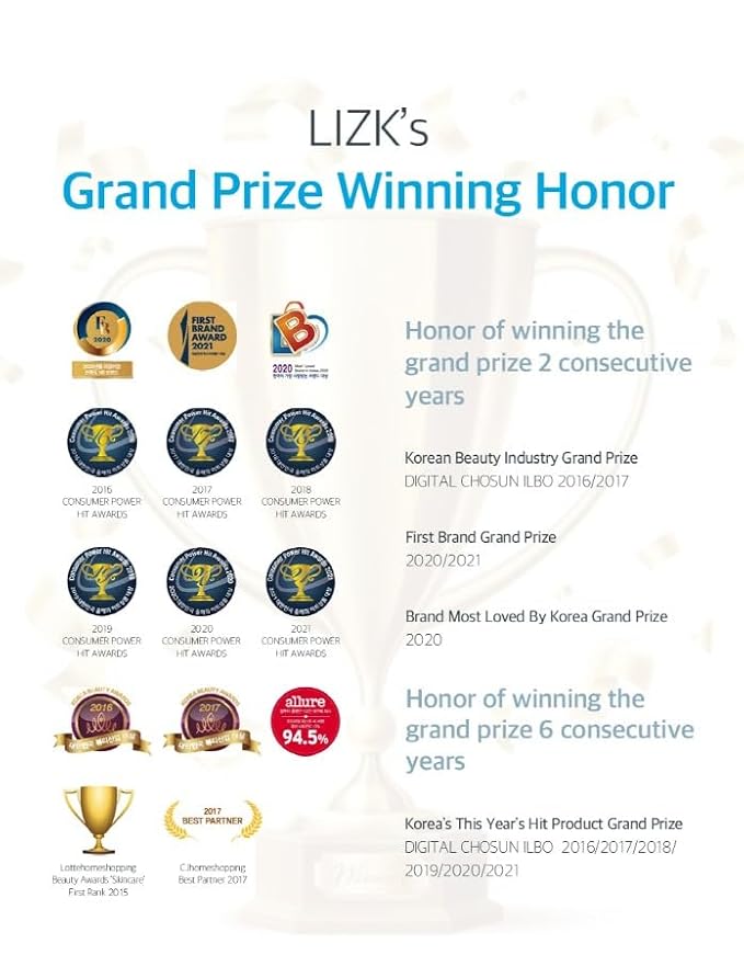 - 💧LIZK Grand Prize winning Honor - received winning honor for 8 years (Korea Beauty industry grand prize, Brand most loved by korea grand prize, etc)