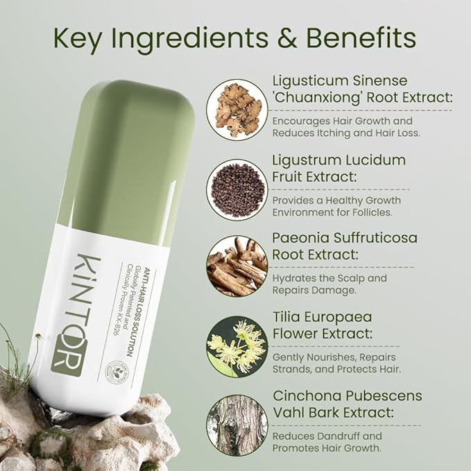 - [KX-826 and Plant-Based Extract Essence] The Core Ingredient KX-826 Improves Hair Follicle Miniaturization and Follicle Shrinkage, Thus Reducing Hair Loss, and The Plant-based Extract Essence Promotes Blood Circulation and Provides Multiple Nutrients to the Hair Root.KX-826 Regulates the Hair Follicle Growth Cycle, Encouraging Healthy Hair Growth. Plant-based Extract Essence Provide Vital Nutrients to Follicles, Ensuring Robust and Natural Hair Growth.