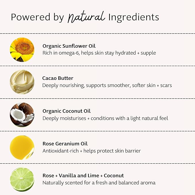 - 2 PACK HYDRATE & NOURISH β This luxurious solid moisturiser melts upon contact, delivering soft, smooth and radiant skin. Formulated with organic cocoa butter, sunflower oil, coconut oil, and plant-based waxes to deeply hydrate and soothe dryness. Includes Rose + Vanilla and Lime + Coconut.