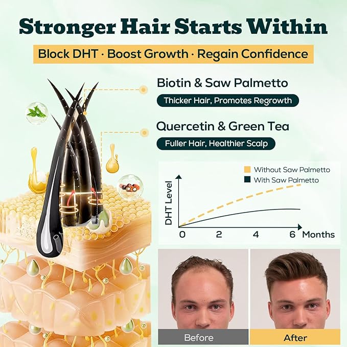 - Reclaim Your Reflection — Fortified DHT Defense in Every Gummy. It’s more than hair—it's about how you see yourself. Each gummy delivers 600mg Saw Palmetto, 10,000mcg Biotin, and a science-backed blend of Green Tea and Quercetin to address what’s standing between you and thicker, fuller strands. Strengthened with Zinc and Vitamin D, this is your daily formula to face the mirror with pride—and confidence you can feel.