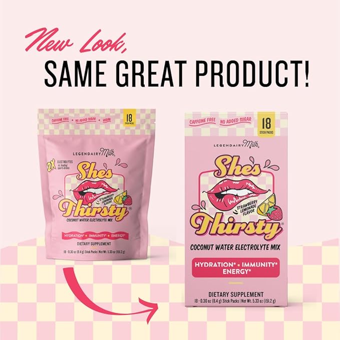 Legendairy Milk She’s Thirsty – Strawberry Lemonade, Hydration Packets | Cortisol Supplement for Stress Relief & Adrenal Support | Coconut Water Electrolytes Powder, No Sugar Added 18 ct
