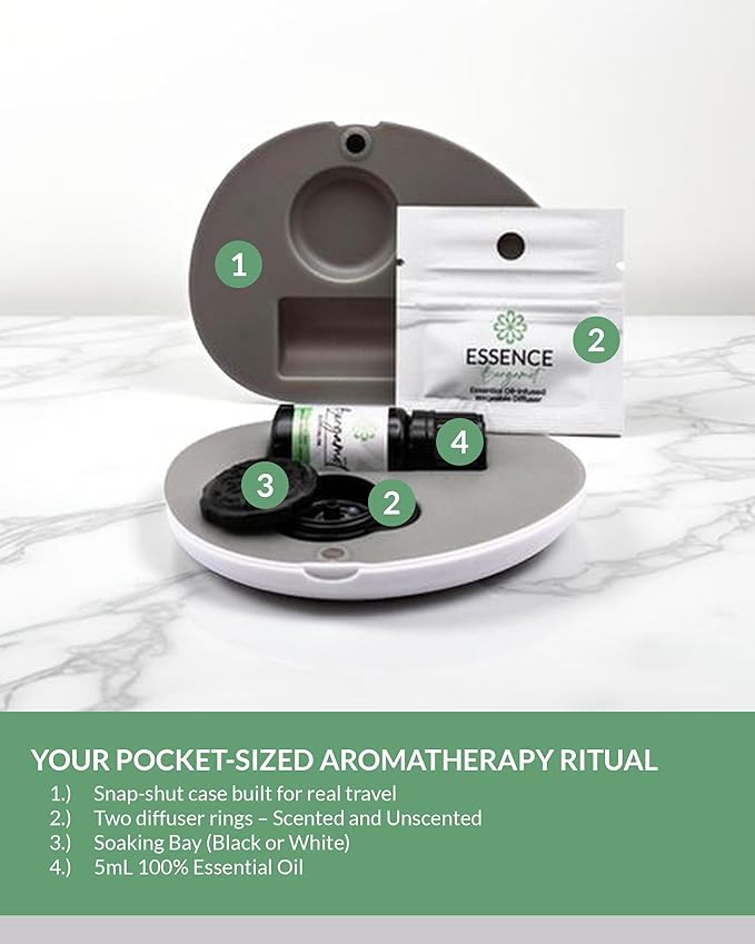 Essence Pearl Travel Case - Wearable Aromatherapy Kit with Nasal Diffuser Rings, Soaking Bay, and 5mL Essential Oil – Portable Wellness Gift Set for On?The?Go Self Care