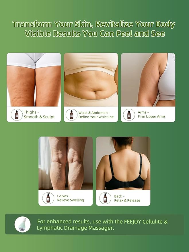 - Massage Oil for Therapy & Circulation Boost: A perfect companion for manual or tool-assisted massage. Promotes detox through improved circulation and lymphatic drainage. For best results, pair with the FEEJOY Cellulite & Lymphatic Drainage Massager to enhance absorption and elevate your routine.