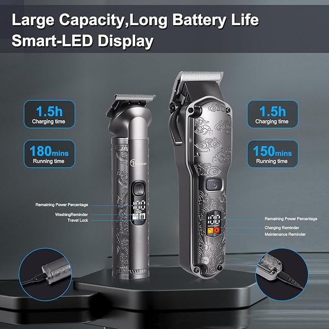 - 【Large battery capacity, long battery life for all-day use】1.5 hour of fully charge, provide up to 150 mins running of the hair clipper and 180mins running of hair trimmer(Fully charge the battery before first use). One full charge can support multiple uses, eliminating the need for frequent charging. Convenient USB charging available anytime, anywhere.