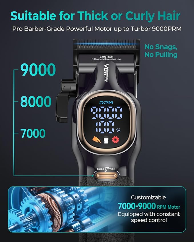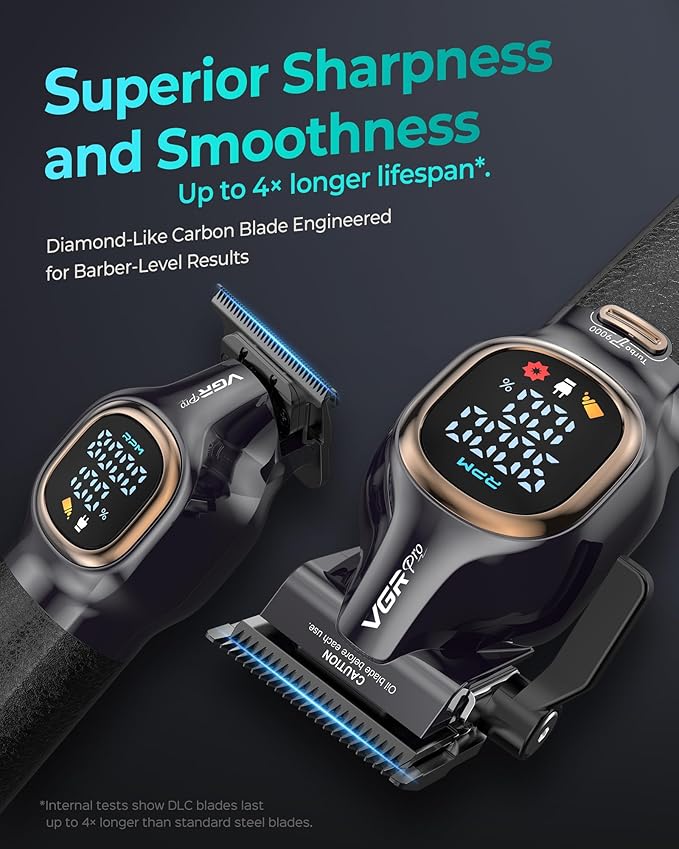- Diamond-Like Carbon Blades for Superior Sharpness & Smoothness – Engineered for barber-level results, the VGRPRO professional hair clippers equipped the DLC blades, provide ultra-sharp, ultra-smooth hair cutting. This clippers can handles full haircuts, and tidying sideburns or necklines, while the zero-gapped precision trimmer (0.1MM) excels at beard, eyebrow and manscaping trimming.