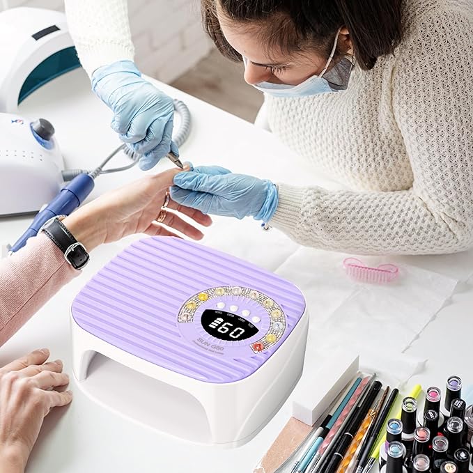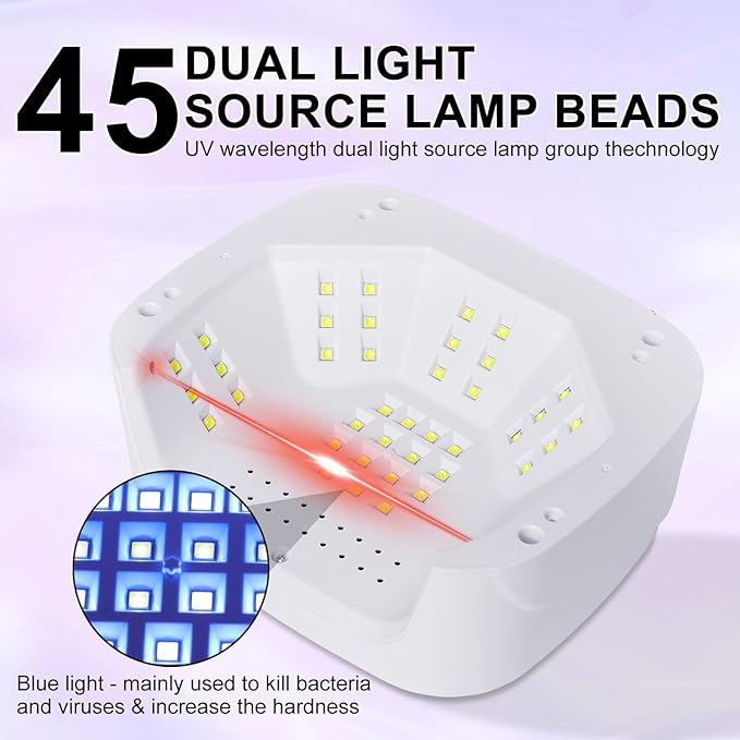 - 【Dual-light Source Rapid Curing】The gel nail uv lamp is equipped with 45 dual-light source lamp beads. The lights are evenly distributed on the top and sides of the lamp, ensuring faster gel polish curing and reduced drying time. The UV light allowing you to achieve professional salon-quality nail art easily and conveniently at home.