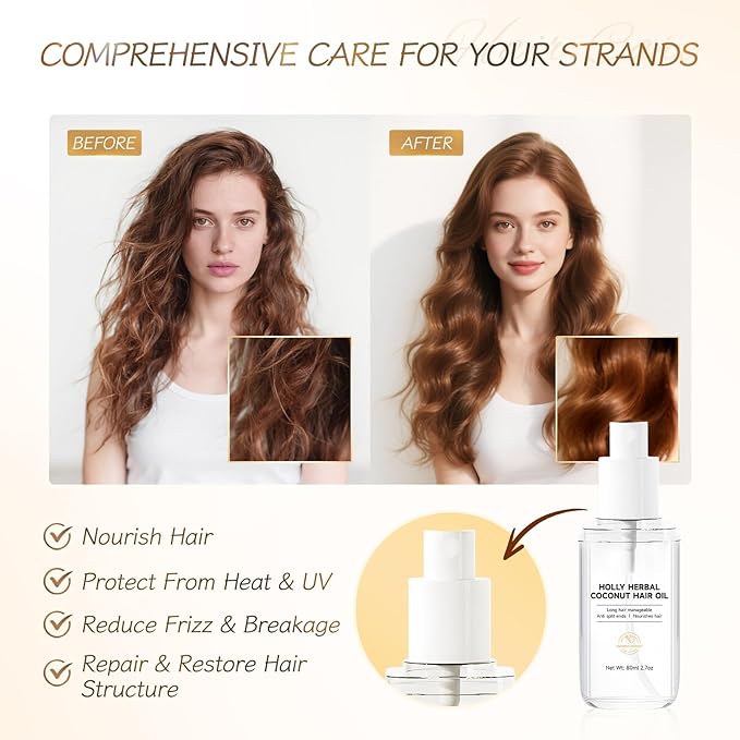 - Hair Oil For Frizzy Hair: Enriched with virgin coconut oil and 6 nourished oil, weightless hydrating hair mist helps strengthen, repair and hydrate hair, leaving it looking glowing, healthy and beautiful with every use