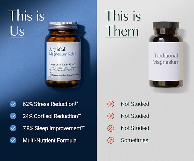 AlgaeCal Magnesium Relax™ - Chelated Magnesium with Ashwagandha for Sleep & Occasional Anxiety - Glycinate, Malate, Citrate - Sleep, Mood, & Cortisol Support (60 Caps - 1 Month Supply)