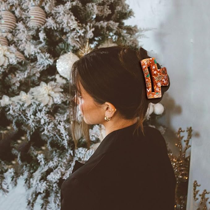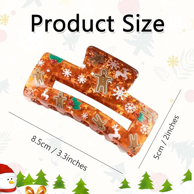 Christmas Hair Clips, Square Hair Claw Clips for Thick/Thin Hair, Orange-Red Glitter Gingerbread Man Snowflake Design Medium Claw Clips, Strong Hold & Non-Slip Hair Styling Accessories for Xmas 1PCS